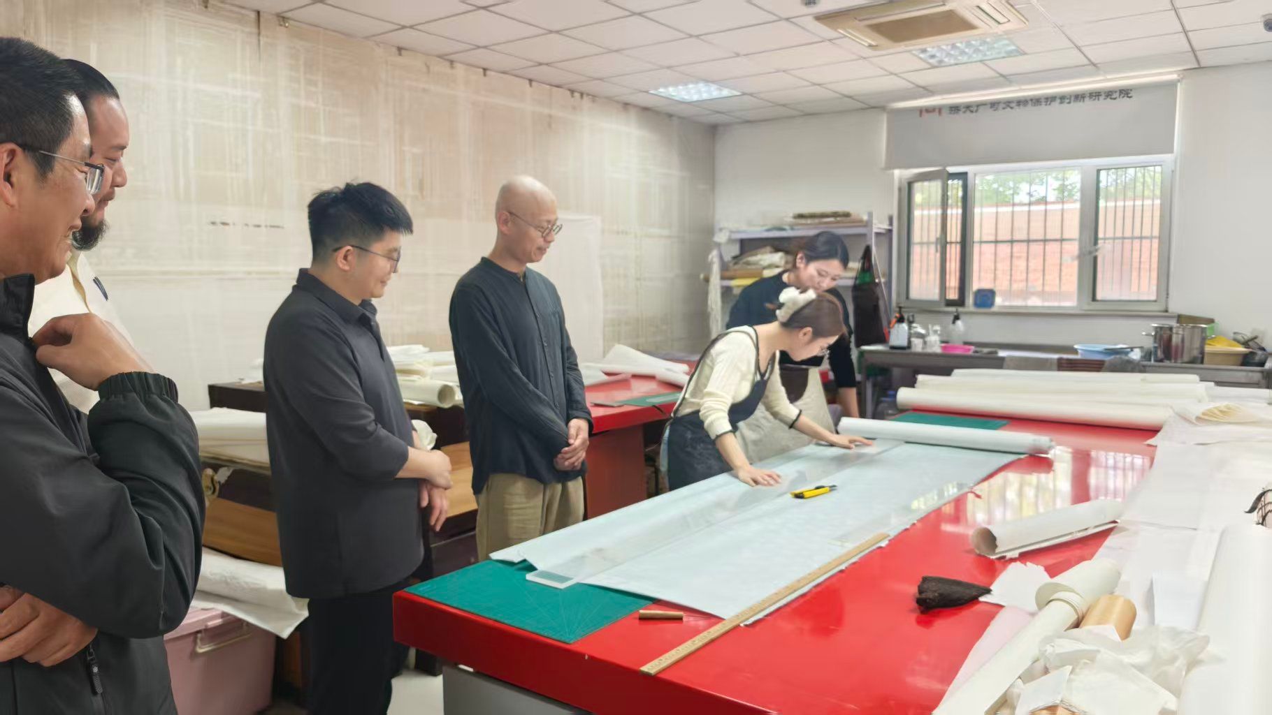 调研团队实地考察了润古轩的文物修复车间。在修复现场,宋述林一行详细听取了企业负责人关于传统书画、古籍文献等文物的修复工艺流程、药剂使用标准及安全防范措施的介绍。调研组重点关注了企业在技术研发与传统技艺结合方面的实际应用,评估了行业对技能型人才的专业化要求。