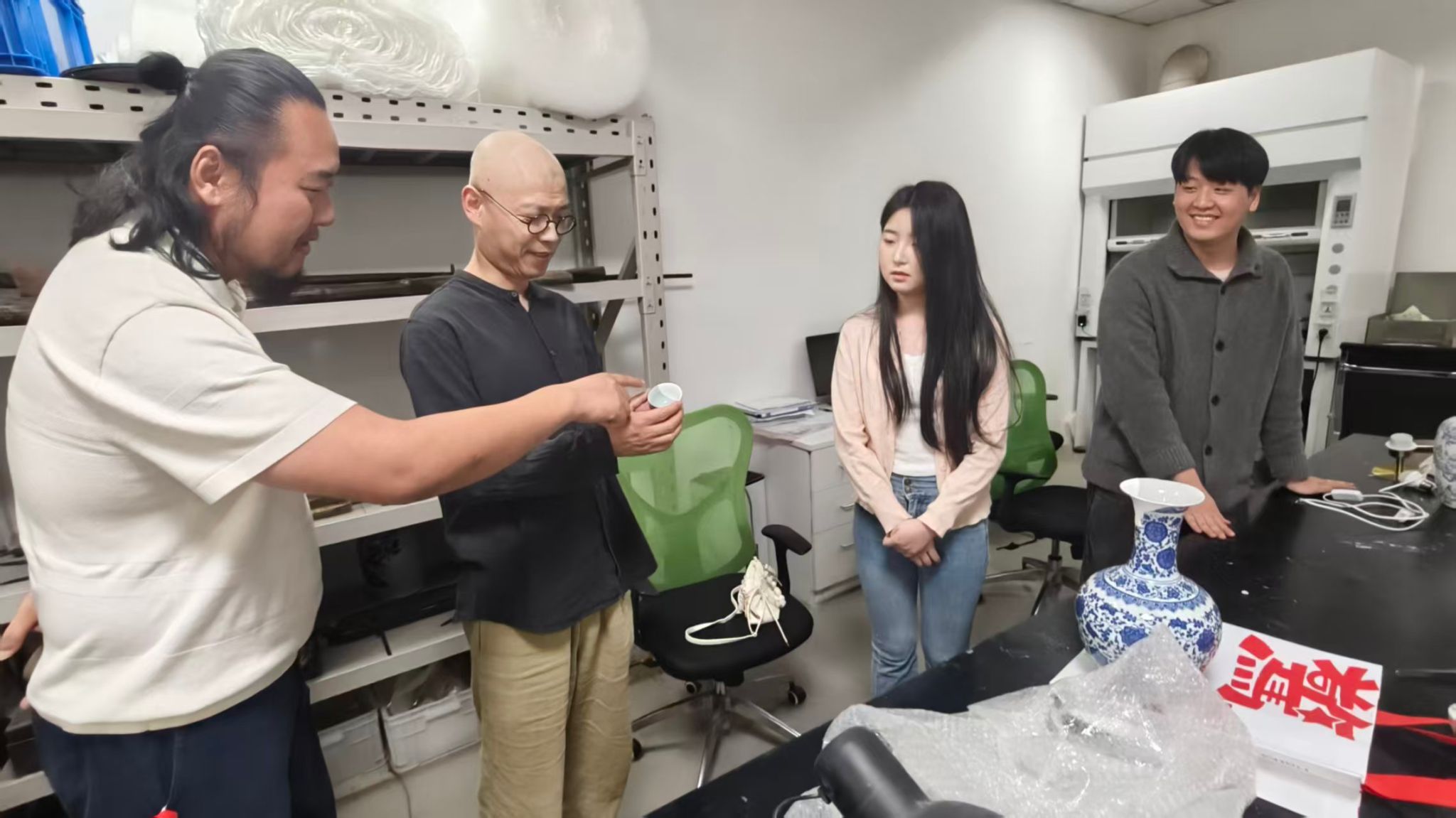 实习学生的操作演示并查阅了其近期修复成果。学生就瓷器补配、书画揭裱、古籍修补等具体任务进行了技术汇报。宋述林对修复作品的精细度、规范性进行了专业点评,实地评估了教学大纲与企业实践环节的衔接效果,收集了关于课程设置与行业标准匹配度的反馈数据。